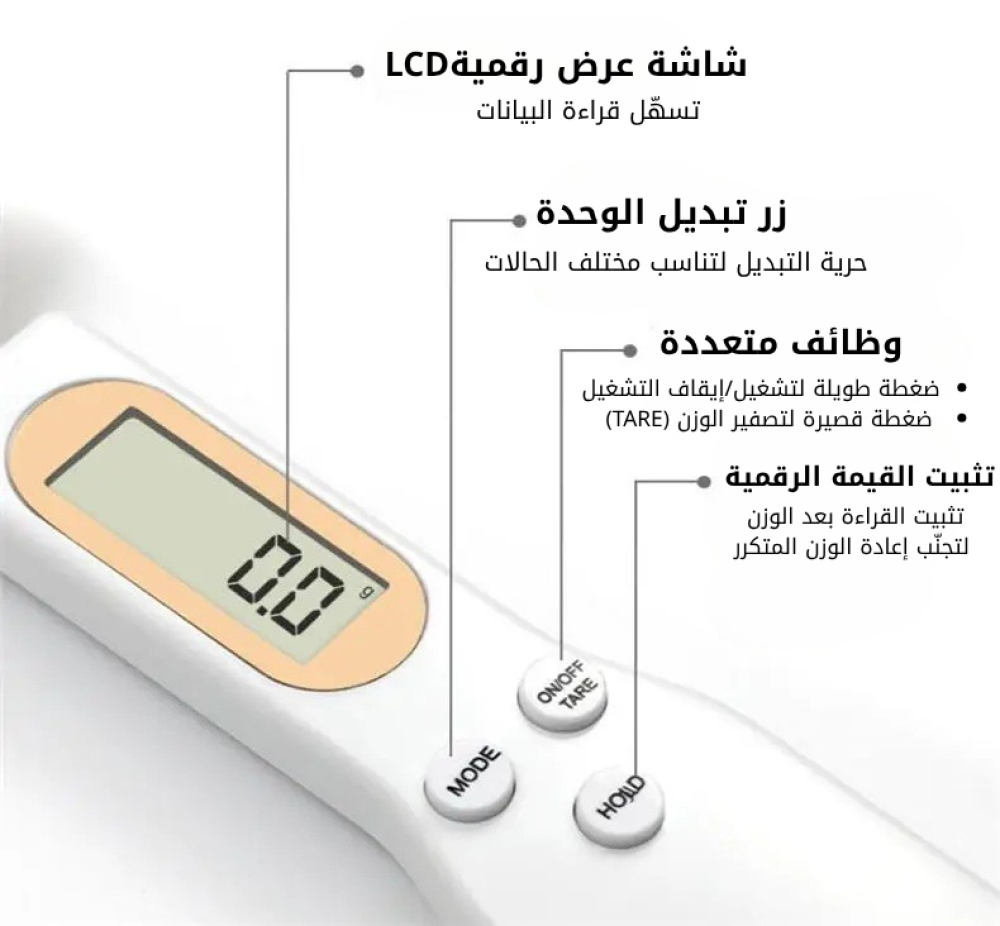 1. شاشة عرض رقمية: يحتوي على شاشة عرض رقمية لقراءة الوزن بشكل سهل وسريع